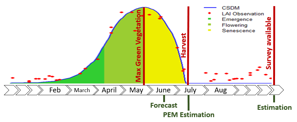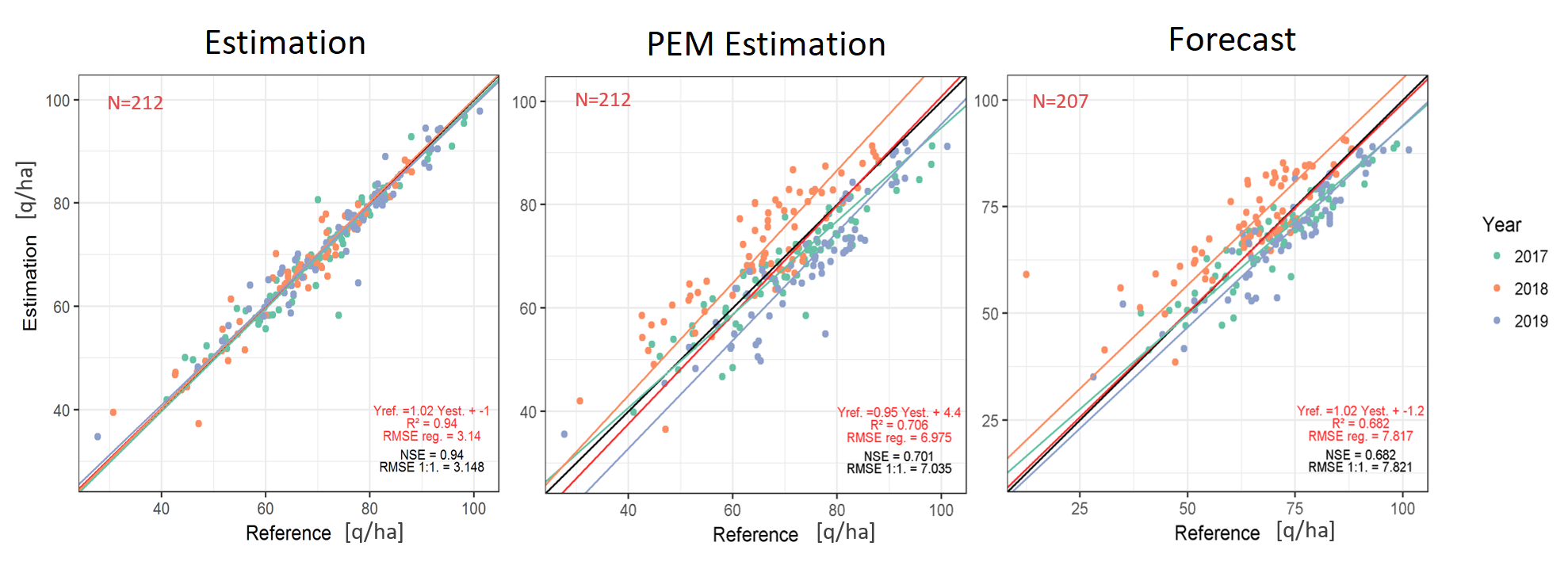 SenCYF best model was designed to estimate the yield of the fields at three periods in the season. The estimation model (models calibrated with the reference yield dataset of the current years) provides an estimation based on the yield reference surveys. The yield estimation computed right after the harvest are based on the pre-existing model (PEM) corresponding to models calibrated with the reference yield dataset of the previous year(s). The forecast model provides the yields as early as mid-June, about one month before the harvest.